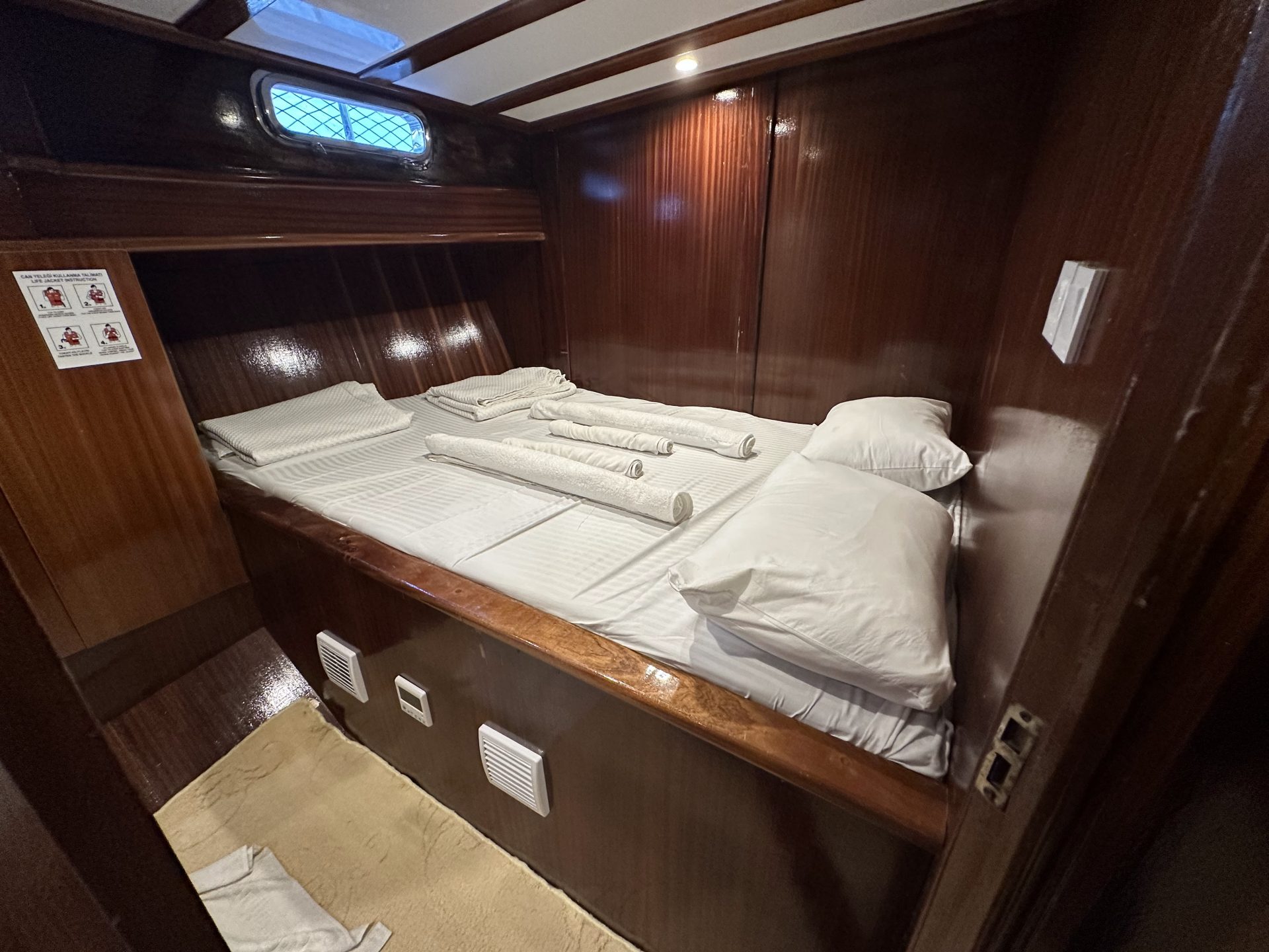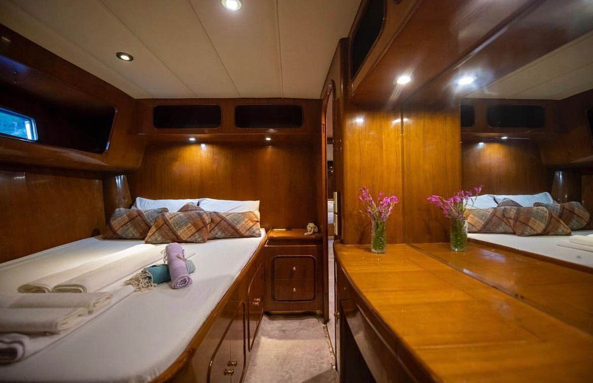 - Повечето яхти имат по едно помещение за 3 души, в което може да се настанят двама възрастни с едно дете – най-често на общо двойно легло с ширина 160-180 см – и е налично на запитване за избраната от вас дата.