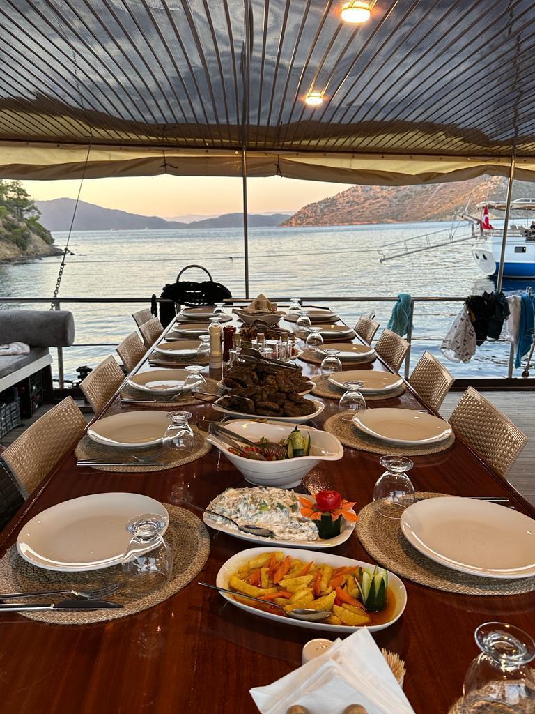 Почивката включва изхранване на пълен пансион с включени закуска, обяд, следобеден чай/кафе и бисквитки и вечеря. Храната се приготвя прясно пред вас от екипажа на яхтата в откритата кухня на палубата. Има поне 2-3 ястия за седмица, приготвени на барбекюто, разположено до носа на яхтата. Храната е вкусна и прясна, но не очаквайте шведска маса с избор от десетки ястия, като в хотел или круиз с огромен круизен кораб.