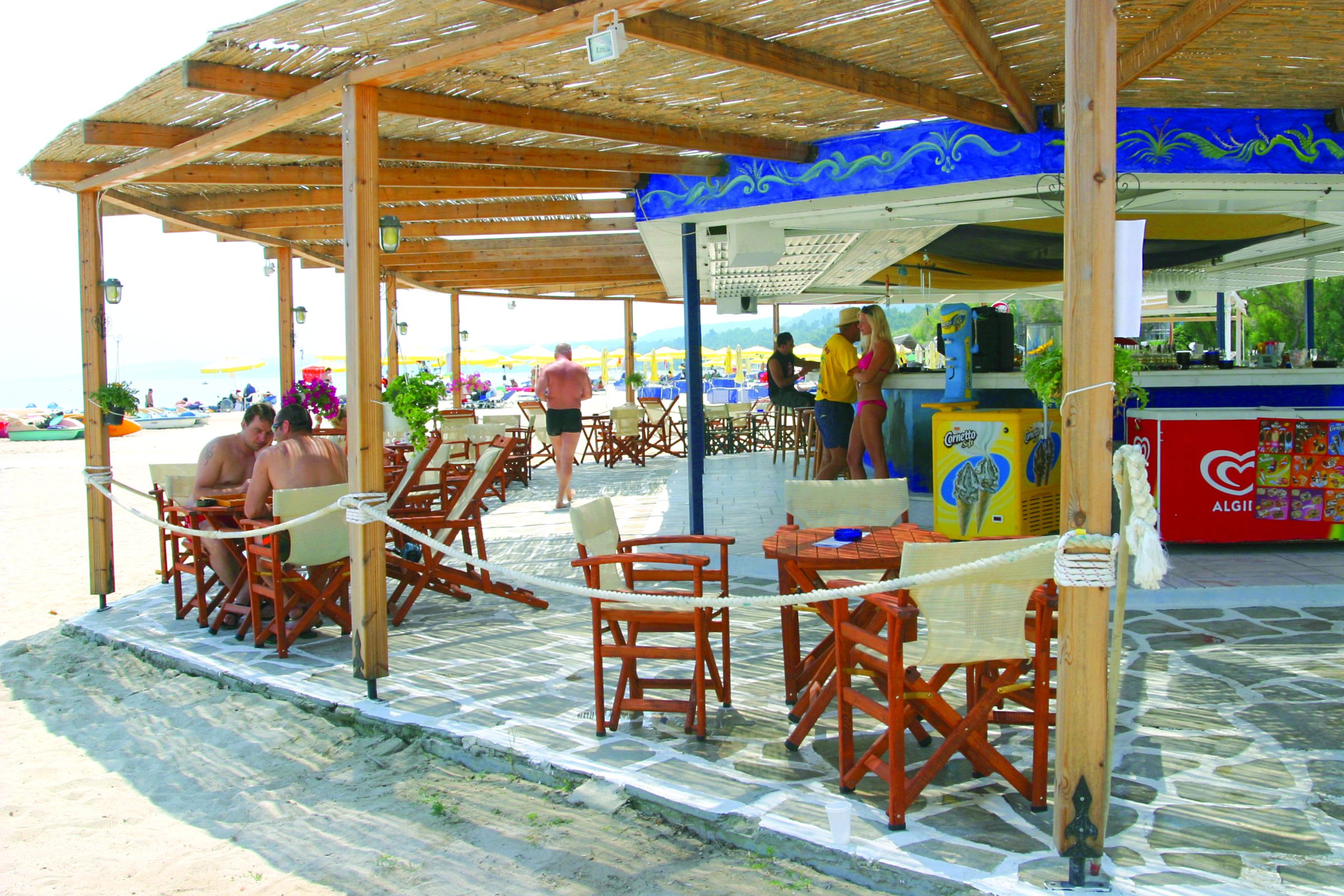Механата Akroyiali отговаря на името си като буквално се намира на плажа върху дървена палуба, в непосредствена близост до морето. Комбинацията от син с бял цвят и свещи е гледка спираща дъха. В механата можете да опитате прясна риба и морски дарове, традиционни гръцки ястия , отбрани вина и др.