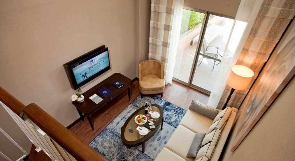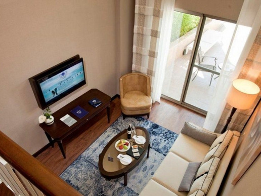 14 двустайни duplex family suite (с изглед към басейна, на първо ниво: всекидневна, баня с душ; на второ ниво: 2 спални с врата, 2 бани: едната е с вана с хидромасажни функции и душ , другата с душ, макс. 4+2 души, 108 m2);